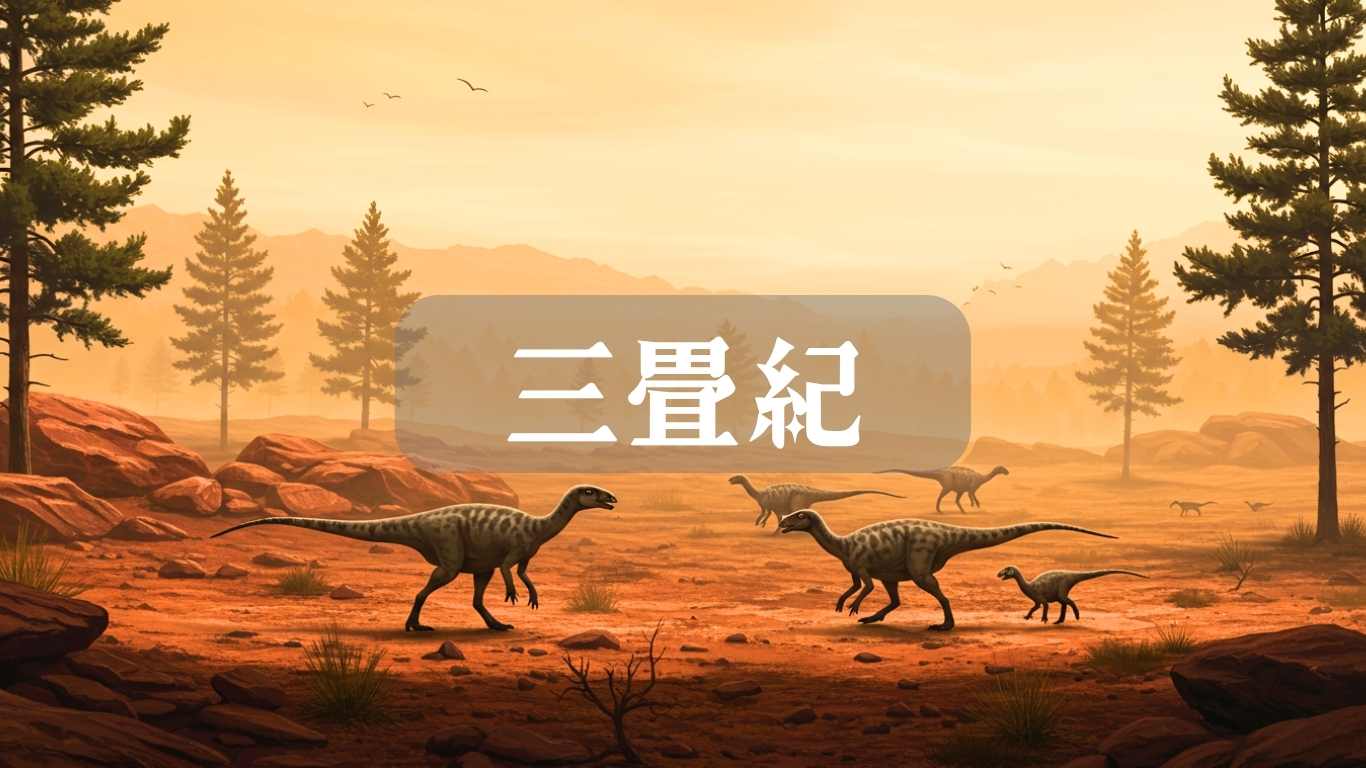 恐竜の時代の始まり。地球は乾燥した赤い大地が広がり、まだ小さくて原始的な恐竜が登場した頃。静かで荒涼とした景色の中に、進化のはじまりの息吹が感じられます。