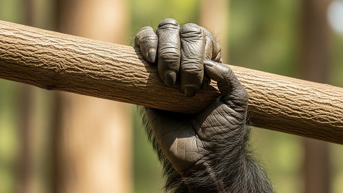 骨の長さや関節の配置は、力のレバー比に影響します。短いレバーで力を出す方が有利な場面と、長いレバーで遠くへ力を伝える方が有利な場面があります。チンパンジーの手や腕の骨格は、握る力を効率よく伝える配置になっている点が強さの一因です。