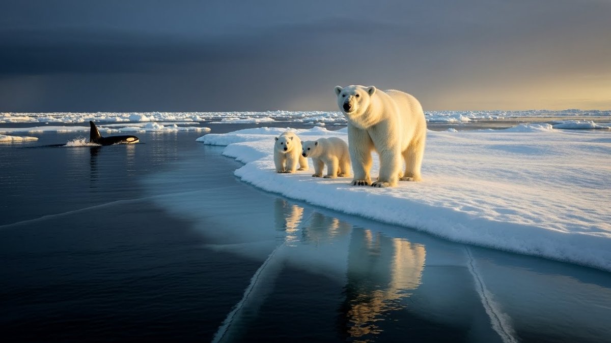 シャチは北極海域でホッキョクグマを襲うケースが記録されています。特に海に落ちた個体や氷の周辺で泳いでいる個体が標的になりやすいです。シャチは協調して狩る能力があり、捕食成功率が高いことで知られています。