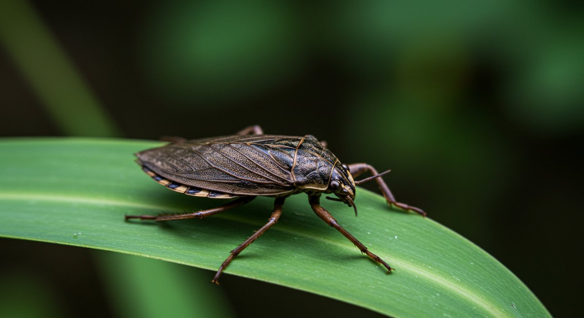 タガメは平たい体と三角形の顔が特徴で、体長は大人の親指ほどの大きさです。全体的に茶色や黒っぽい色をしており、後ろ足がオールのように平べったくなっています。これは水中を泳ぐための進化によるもので、他の水生昆虫と区別しやすい特徴です。